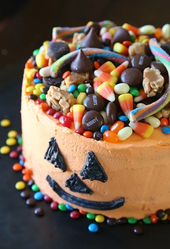 This cake looks like a Jack-O-Lantern overflowing with candy. Who could resist?